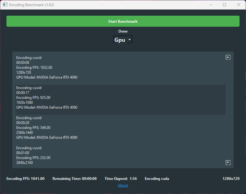This application benchmarks the efficiency of different hardware acceleration technologies provided by Nvidia, AMD, and Intel GPUs, as well as CPU-based encoding