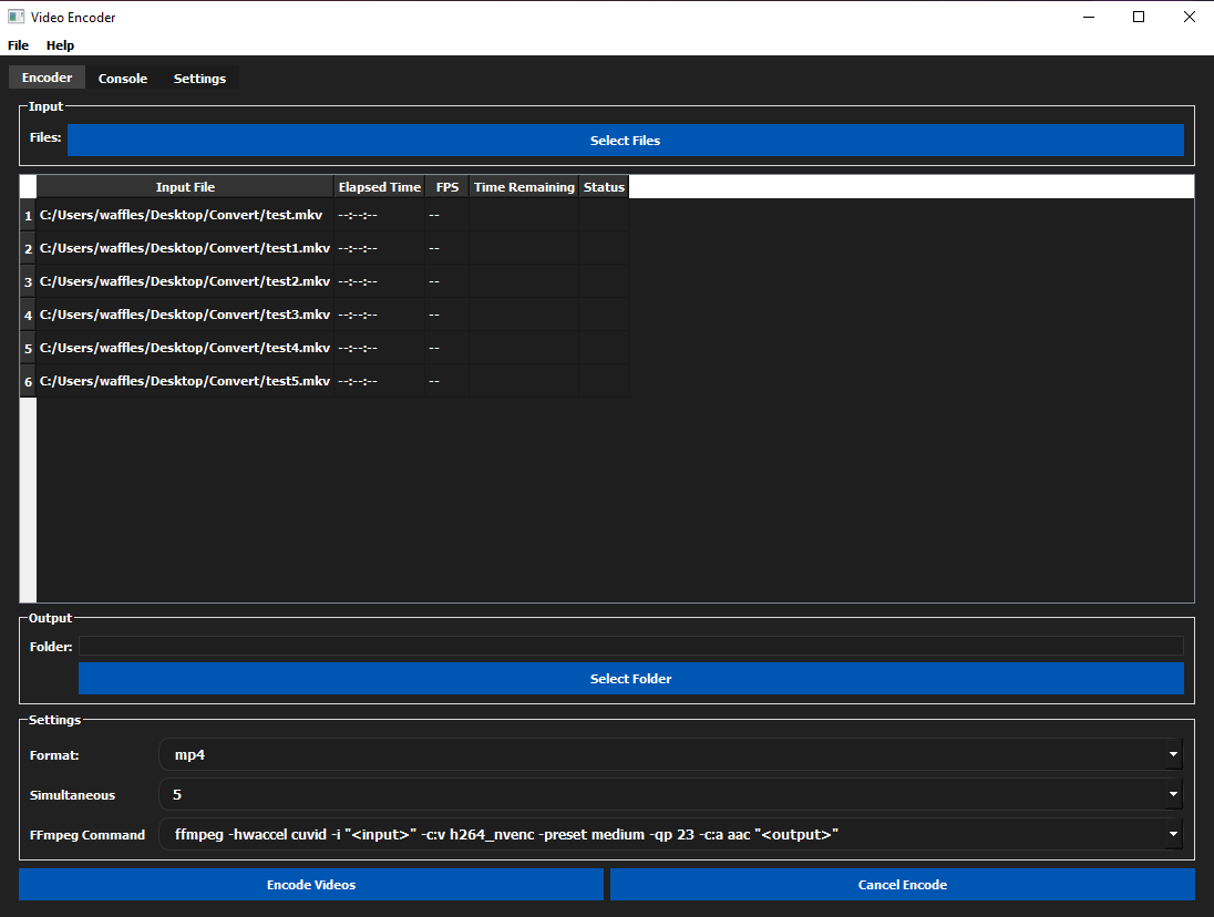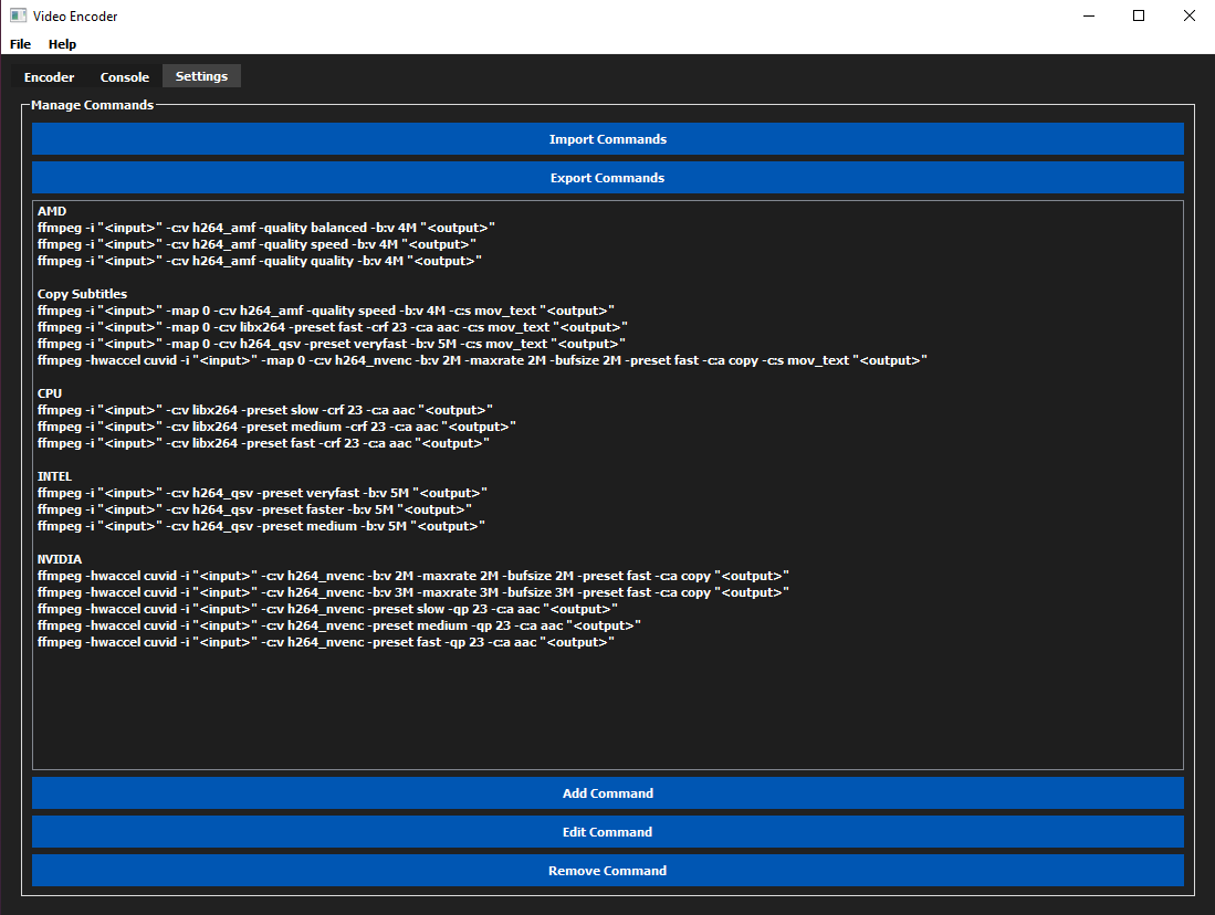 Flexible Command Customization: Includes a system for customizing ffmpeg commands. Users can insert placeholders like "" and "" within commands to automatically handle file paths, making the tool adaptable to various workflows.